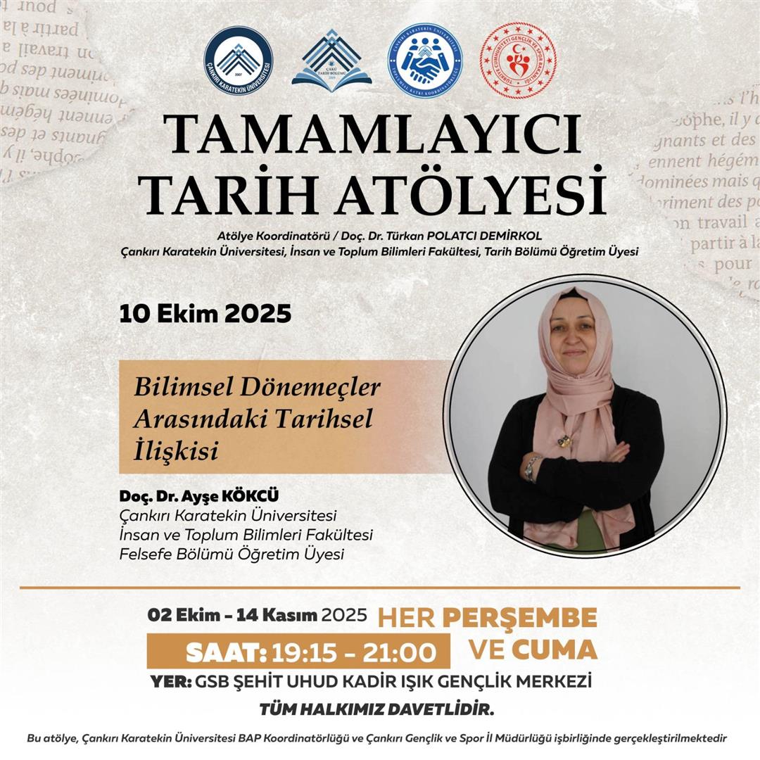Tamamlayıcı Tarih Atölyesi seminerleri kapsamında bölümümüz öğretim üyelerinden Doç. Dr. Ayşe KÖKCÜ" Bilimsel Dönemeçler Arasındaki Tarihsel İlişki" konulu konferansını gerçekleştirmiştir.