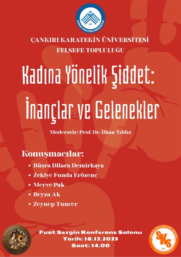 ÇAKÜ Felsefe Topluluğunun Sosyoloji Bölümü ile ortak bir çalışması olan "Kadına Yönelik Şiddet: İnançlar ve Gelenekler" konferansında Sosyoloji Bölümü öğrencileri ile bölümümüzden 2. sınıf öğrencisi Büşra Dilara DEMİRKAYA da konuşmalarını gerçekleştirmişlerdir.
