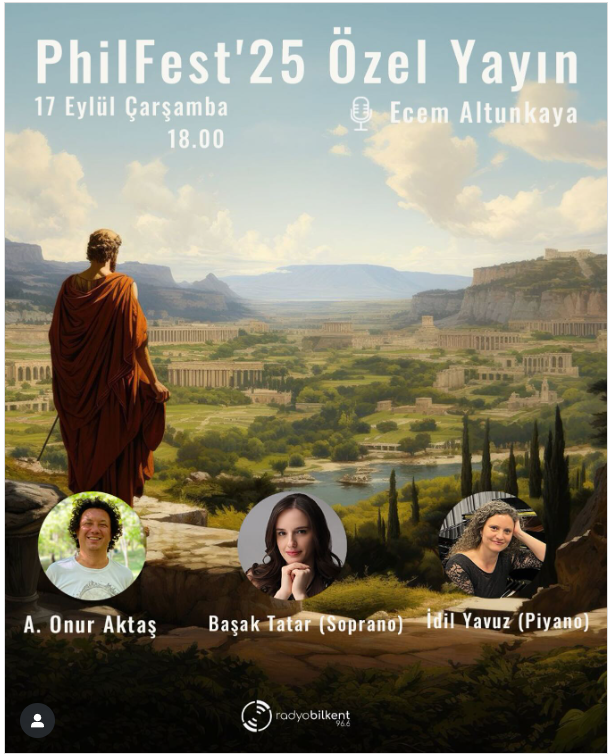 "17 Eylül 2025, Perşembe günü saat 18.00’de, bölümümüz öğretim üyelerinden Doç. Dr. Abdullah Onur Aktaş, Başkent Üniversitesi’nden soprano Başak Tatar ve piyanist İdil Yavuz ile birlikte, Ecem Altunkaya’nın moderatörlüğünde Radyo Bilkent’in Felsefe Şenliği 2025 Özel Yayınına konuk olmuştur.