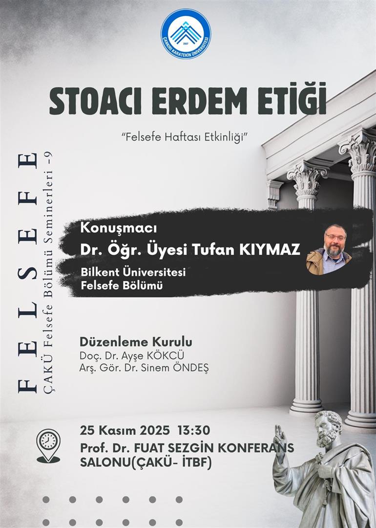 Çakü Felsefe Bölümü Seminerleri dizisinin 9. su olan "Stoacı Erdem Etiği" başlıklı konferans, Bilkent Üniversitesi Öğretim üyelerinden Dr. Öğr. Üyesi Tufan KIYMAZ tarafından 25.11.2025 tarihinde saat 13.30`da İnsan ve Toplum Bilimleri Fakültesi Prof. Dr. Fuat SEZGİN Konferans Salonu`nda gerçekleştirilecektir.